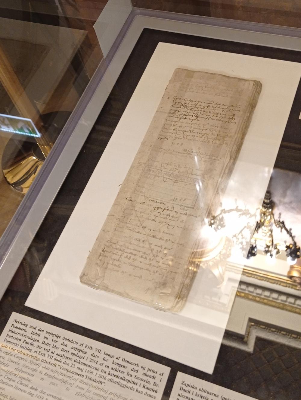 • zapiska obituarna (pośmiertna) zawierająca dokładną datę śmierci Eryka VII, króla Danii i księcia pomorskiego. Do 2014 roku dokładna data śmierci króla była nieznana, a ustalił ją dopiero szczeciński archiwista na podstawie analizy dokumentów Kapituły Katedralnej w Kamieniu Pomorskim – król Eryk VII zmarł 23 maja 1459 roku;