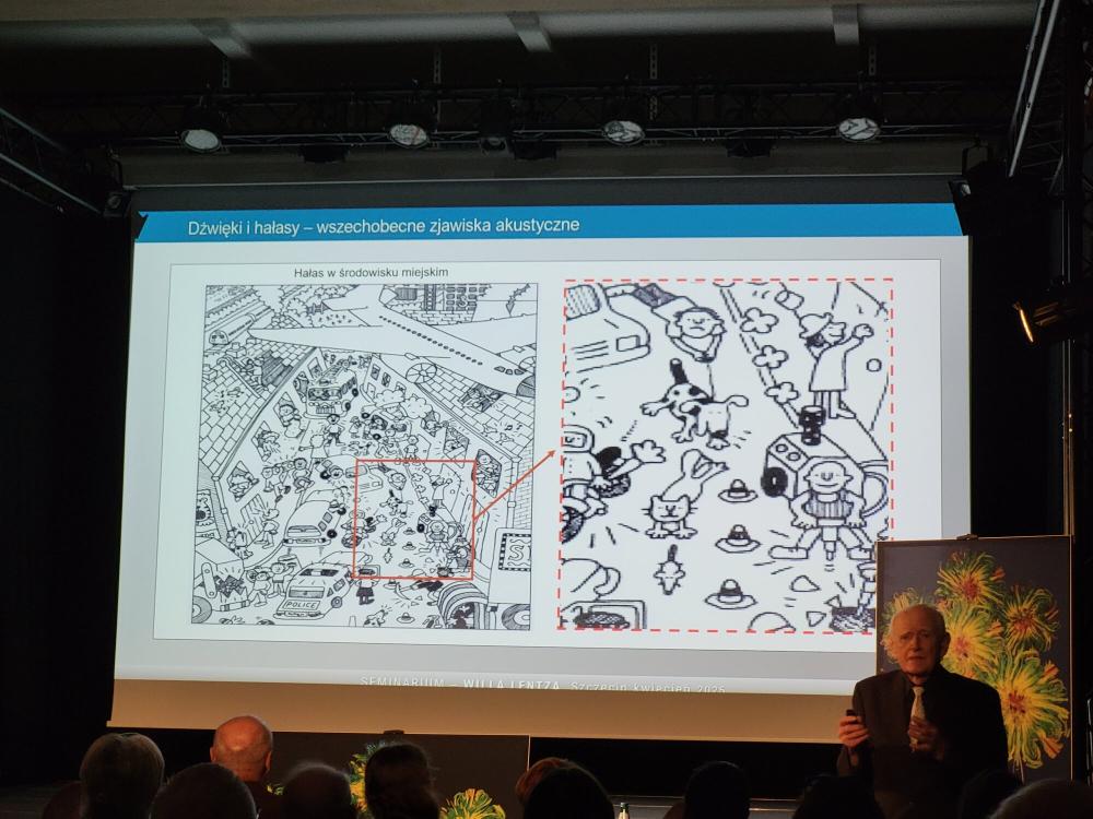 Prelegentem był wybitny specjalista – prof. dr hab. inż. Stefan Weyna, autor ponad 350 publikacji naukowych, którego badania zdobyły uznanie w krajowych i zagranicznych ośrodkach naukowych. 📚🌍 Wykład prof. Weyny przyciągnął liczne grono miłośników nauki, muzyki i kultury, którzy z zainteresowaniem śledzili opowieść o niewidzialnych, a jednak wszechobecnych zjawiskach akustycznych. 🎼👀