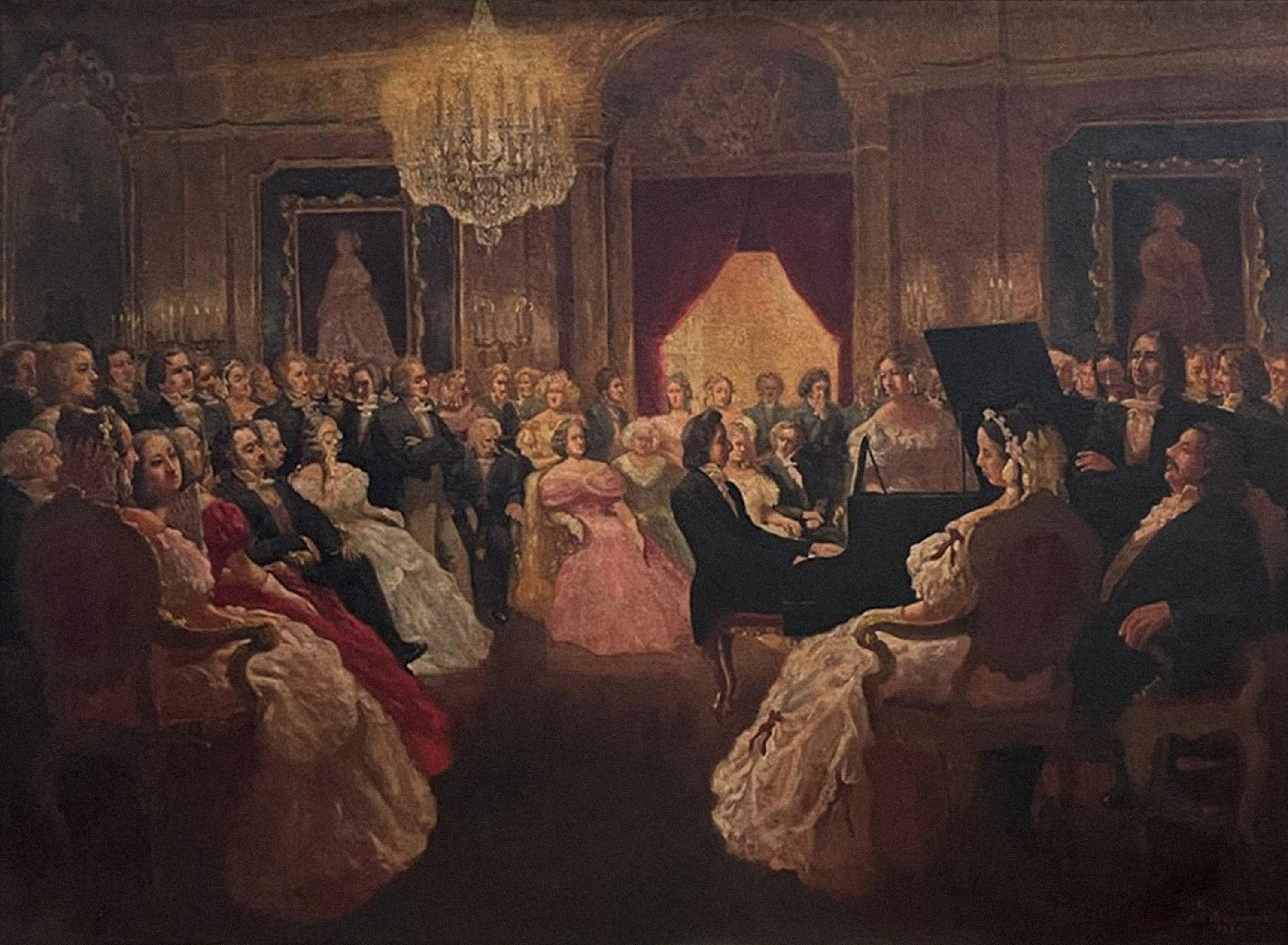 Obraz prezentujący koncert Fryderyka Chopina autorstwa Henryka Ostachiewicza. Dzieło udostępnione dzięki uprzejmości KANCELARII WÓDKIEWICZ & SOSNOWSKI. ADWOKACI I RADY PRAWNI.